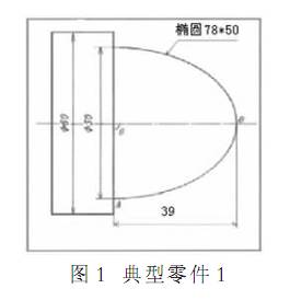 如圖 1 所示零件 該零件編程時以橢圓右端中心 O 點作為編程原點 由于加工的橢圓極角 為 90 所以可以采用將橢圓極角設(shè)為自變量 當(dāng)橢圓極角從 O 點 0 逐漸增加到 A 點 90 時 根據(jù)橢圓參數(shù)方程求得橢圓 OA 段上每個點所對應(yīng)的短軸值和長軸值 然后再算出橢圓 OA 段上每個點在工件坐標(biāo)系中所對應(yīng)的 X 值和 Z 值 從而加工出橢圓 編程中采用條件轉(zhuǎn)移 IF 語句 該橢圓的參數(shù)方程 X=39*COS ,Y=25*SIN 其中 X 表示橢圓長軸值 Y 表示橢圓短軸值 表示橢圓極角