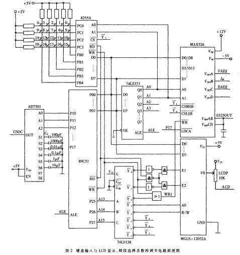 數(shù)字化波形發(fā)生器主要由主控制器單片機(jī) 89C52、鍵盤與顯示電路、波形發(fā)生器 MAX038、 12 位 4 路數(shù)模轉(zhuǎn)換器 MAX526、頻段控制單元、幅值控制單元等單元電 路 組 成 。 單 片 機(jī) 主 要 完 成 對(duì) 鍵 盤 輸 入 的 檢 測(cè) 、對(duì)MAX038 輸出波形的選擇、 對(duì) D/A 輸出控制, 從而完成對(duì)頻率和占空比的調(diào)節(jié)及對(duì)頻段的選擇; 鍵盤采用 4× 5的矩陣鍵盤, 分別設(shè)置了數(shù)字鍵( 0~9) 和功能鍵( 小數(shù)點(diǎn)" ."、 頻段、 頻率、 占空比、 幅值、 正弦波、 方波、 三角波、取消等) 共 19 個(gè)鍵。使用時(shí)先按功能鍵后按數(shù)字鍵; 顯示部分采用 LCD 顯示頻率(6 位)和幅值(4 位); MAX038函數(shù)發(fā)生器芯片是系統(tǒng)的核心部分, 在單片機(jī)的控制下輸出正弦波、 三角波、 矩形波, 且波形的頻率和占空比易于調(diào)節(jié); 12 位 4 路輸出的數(shù)模轉(zhuǎn)換器 MAX526 在單片機(jī)的控制下, 輸出 2~750μ A 的電流及± 2.4V 和± 2.3V 的電壓, 分別進(jìn)行頻率、 占空比的調(diào)節(jié); 頻段選擇單元采用 8選 1 的多路模擬開(kāi)關(guān) AD7501, 在單片機(jī)的控制下使每一路分時(shí)選通, 將不同的電容值 CF 接入 MAX038 電路中, 就可確定輸出頻率范圍, 即頻段, 共有 6 個(gè)頻段供選擇切換, 輸出波形頻率范圍與 CF 的關(guān)系如表 1 所示。幅度控制單元主要調(diào)節(jié)輸出信號(hào)的幅度, MAX038 輸出端OUT 的 VP - P =2V 幅度值通過(guò)放大器放大后送入數(shù)字衰減器 AT- 280 中進(jìn)行衰減, 調(diào)整放大后的輸出幅度。鍵盤輸入與顯示、 頻段選擇及數(shù)控調(diào)節(jié)電路原理圖如圖 2所示。