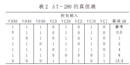 MAX038 的輸出信號(hào)本身在輸出級(jí)有內(nèi)部的輸出放大器, 具有很強(qiáng)的驅(qū)動(dòng)能力, 且輸出阻抗小于 0.1Ω, 但是, 由于其輸出波形的幅度為 2VP- P, 若要調(diào)節(jié)它的輸出幅度, 特別是當(dāng)輸出頻率較高、 輸出波形不是正弦波時(shí),要進(jìn)行幅度放大相當(dāng)困難。所以, 要為 MAX038 的 3 種10Hz~10MHz 輸出波形配置一種通用的全帶寬后級(jí)輸出放大器。放大以后的輸出信號(hào)送入數(shù)字衰減器 AT- 280進(jìn)行衰減。AT- 280 是一種采用 SOIC- 16 塑封表貼封裝形式的 5 位、 0.5B 步距的數(shù)字衰減器, 非常適用于高精度衰減、 快速開(kāi)關(guān)、 極低功耗要求的場(chǎng)合, 其可靠性非常高。VC1、 VC10、 VC2、 VC20、 VC3、 VC30、 VC40、 VC50 分別為 數(shù) 據(jù) 控 制 端 ; RF1 和 RF2 分 別 為 信 號(hào) 輸 入 輸 出 端 。AT- 280 的真值表如表 2 所示。