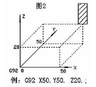 指令中的 X- Y- Z- 是刀具上某一點 (一般是刀具基準(zhǔn)點)在新建工件坐標(biāo)系中的坐標(biāo)值(圖 2)。由于用 G92(G50)指令建立的坐標(biāo)系原點是根據(jù)刀具位置確定的, 當(dāng)程序啟動時刀具處于機(jī)床不同位置, 工件坐標(biāo)系原點的位置也隨之改變。所以用這種方式建立工件坐標(biāo)系時, 編程人員需要在工序簡圖中標(biāo)出刀具位置, 程序啟動前一定要把刀具移動到這個指定的位置。為了在加工下一工件時不致發(fā)生坐標(biāo)原點改變, 程序結(jié)束時應(yīng)當(dāng)把刀具移回程序開始時的位置。