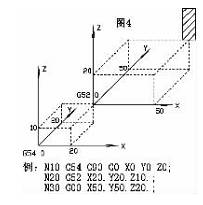 局部坐標(biāo)系是在工件坐標(biāo)系 G54- G59 中的設(shè)置的子坐標(biāo)系(圖 4) , 局部坐標(biāo)系在程序中用指令 G52 設(shè)置取消。