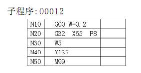 根據(jù)以上分析,用刀寬為端面矩形螺紋車刀,以右刀尖為對刀點(diǎn),對圖(一)所示零件圖中數(shù)控車削端面矩形螺紋時所編制的程序如下表: