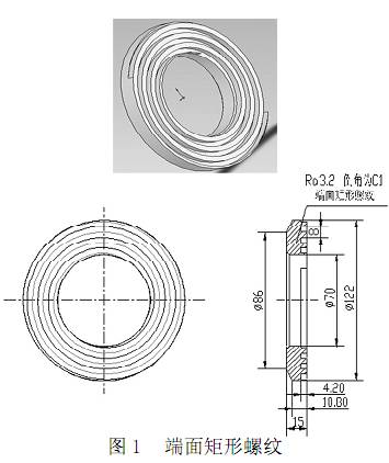 在普通車床加工的螺紋通常都是軸向的,但現(xiàn)在要加工的是比較少用的端面螺紋,且是非標(biāo)準(zhǔn)的矩形螺紋,故有其一定的技術(shù)難度,如圖1 所示是螺距為8mm 的右旋端面矩形螺紋的零件圖,材料為45號鋼。